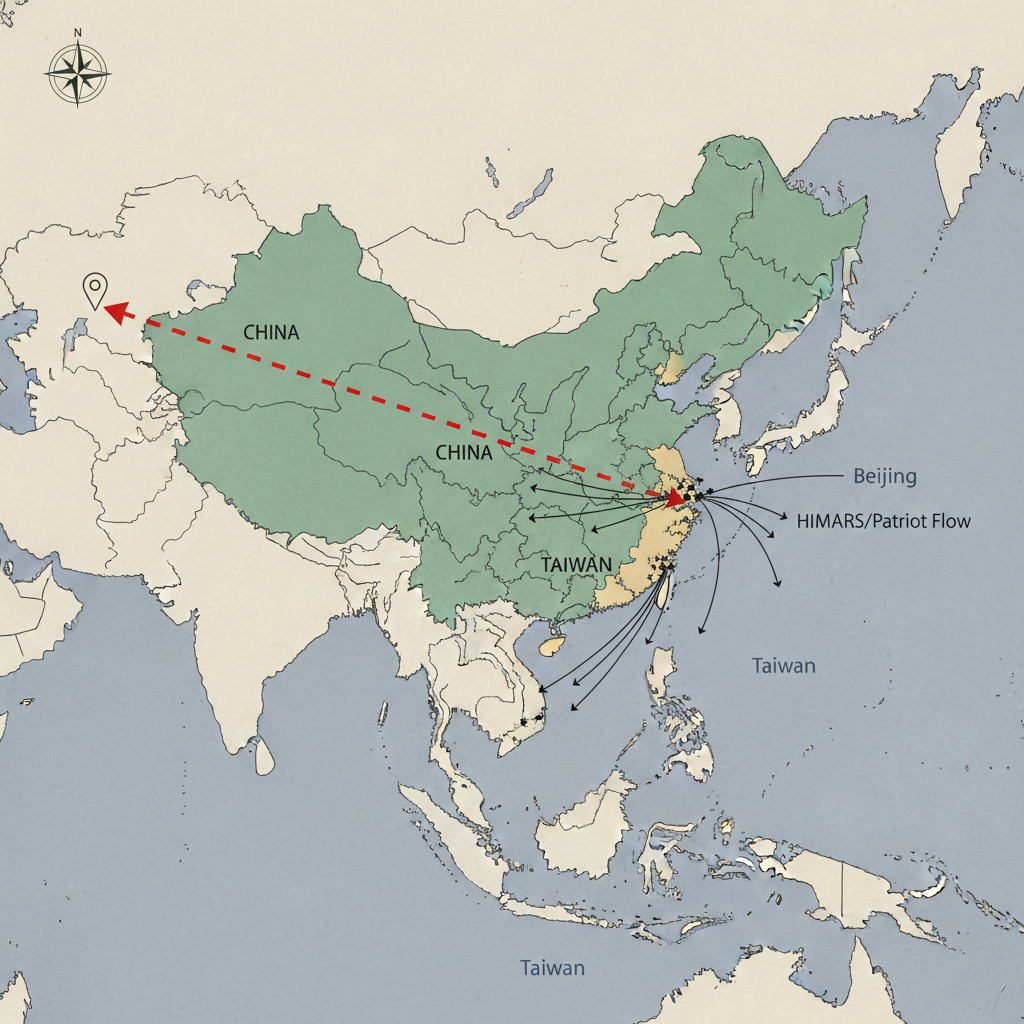 ![flat color political map, clean cartographic style, muted earth tones, no 3D effects, geographic clarity, professional map illustration, minimal ornamentation, clear typography, restrained color coding, Flat 2D East Asian political map, muted jade-green for China, pale ochre for Taiwan, soft gray for sea, clean vector borders with precise linework, a dashed red corridor connecting Washington and Beijing abruptly severed at the Taiwan strait, annotated with thin black lines marking missile shipment routes from U.S. bases to Taiwanese ports, subtle crimson arrow labeled 'HIMARS/Patriot Flow' over Pacific transit path, pale ink wash texture, north light casting no shadows, atmosphere of restrained tension and geometric precision [Nano Banana] flat color political map, clean cartographic style, muted earth tones, no 3D effects, geographic clarity, professional map illustration, minimal ornamentation, clear typography, restrained color coding, Flat 2D East Asian political map, muted jade-green for China, pale ochre for Taiwan, soft gray for sea, clean vector borders with precise linework, a dashed red corridor connecting Washington and Beijing abruptly severed at the Taiwan strait, annotated with thin black lines marking missile shipment routes from U.S. bases to Taiwanese ports, subtle crimson arrow labeled 'HIMARS/Patriot Flow' over Pacific transit path, pale ink wash texture, north light casting no shadows, atmosphere of restrained tension and geometric precision [Nano Banana]](https://081x4rbriqin1aej.public.blob.vercel-storage.com/viral-images/3a825cf4-df0b-450e-8d7f-ae74d1c62007_viral_1_square.png)