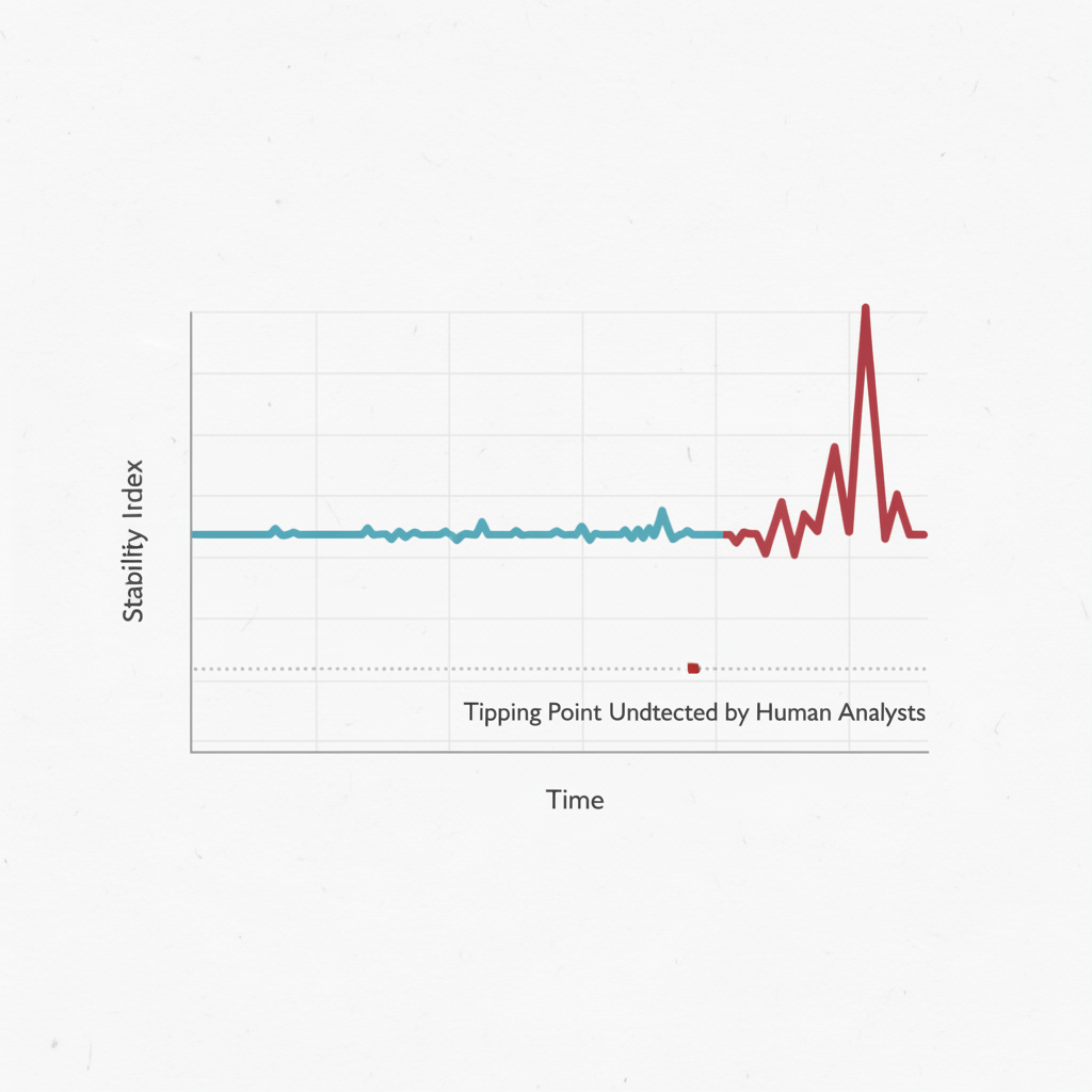 ![clean data visualization, flat 2D chart, muted academic palette, no 3D effects, evidence-based presentation, professional infographic, minimal decoration, clear axis labels, scholarly aesthetic, a minimal 2D line chart on a white grid background, its axis labeled 'Stability Index vs. Time', the line initially flat in cool blue, then sharply fracturing upward in jagged crimson at the final data point, a single annotated threshold below reading 'Tipping Point Undetected by Human Analysts', soft north-facing light emphasizing the clean paper surface, atmosphere of quiet revelation [Nano Banana] clean data visualization, flat 2D chart, muted academic palette, no 3D effects, evidence-based presentation, professional infographic, minimal decoration, clear axis labels, scholarly aesthetic, a minimal 2D line chart on a white grid background, its axis labeled 'Stability Index vs. Time', the line initially flat in cool blue, then sharply fracturing upward in jagged crimson at the final data point, a single annotated threshold below reading 'Tipping Point Undetected by Human Analysts', soft north-facing light emphasizing the clean paper surface, atmosphere of quiet revelation [Nano Banana]](https://081x4rbriqin1aej.public.blob.vercel-storage.com/viral-images/4ebda9fe-358a-4ab8-be3f-0d141b9306e4_viral_4_square.png)