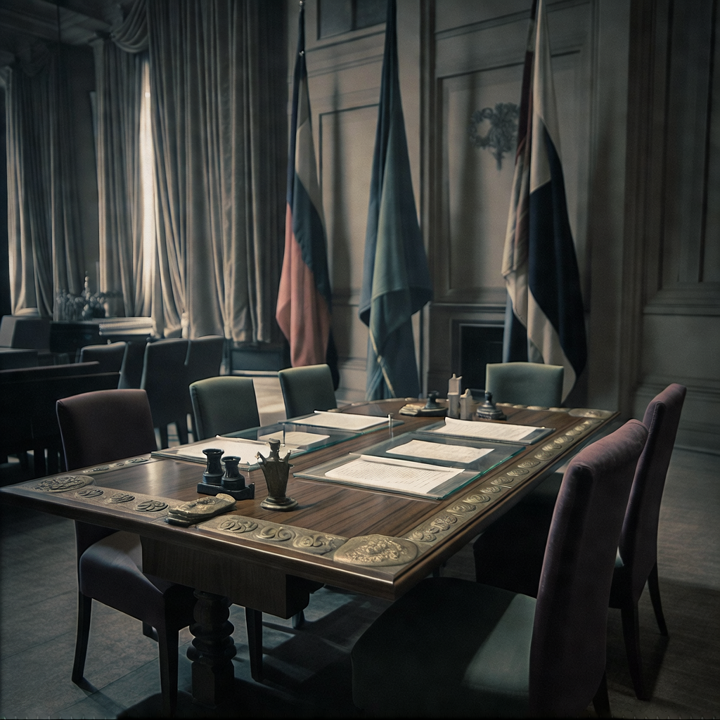 ![muted documentary photography, diplomatic setting, formal atmosphere, institutional gravitas, desaturated color palette, press photography style, 35mm film grain, natural lighting, professional photojournalism, an unattended treaty signing table, polished walnut with inlaid national emblems in tarnished brass, side-lit from heavy velvet drapes in a cavernous hall, atmosphere of suspended decision—inkwells dry, empty chairs face sealed documents under glass, flags of major powers hang motionless in still air [Bria Fibo] muted documentary photography, diplomatic setting, formal atmosphere, institutional gravitas, desaturated color palette, press photography style, 35mm film grain, natural lighting, professional photojournalism, an unattended treaty signing table, polished walnut with inlaid national emblems in tarnished brass, side-lit from heavy velvet drapes in a cavernous hall, atmosphere of suspended decision—inkwells dry, empty chairs face sealed documents under glass, flags of major powers hang motionless in still air [Bria Fibo]](https://081x4rbriqin1aej.public.blob.vercel-storage.com/viral-images/50e87b02-3ad3-4a85-838e-b5124b06dda8_viral_0_square.png)