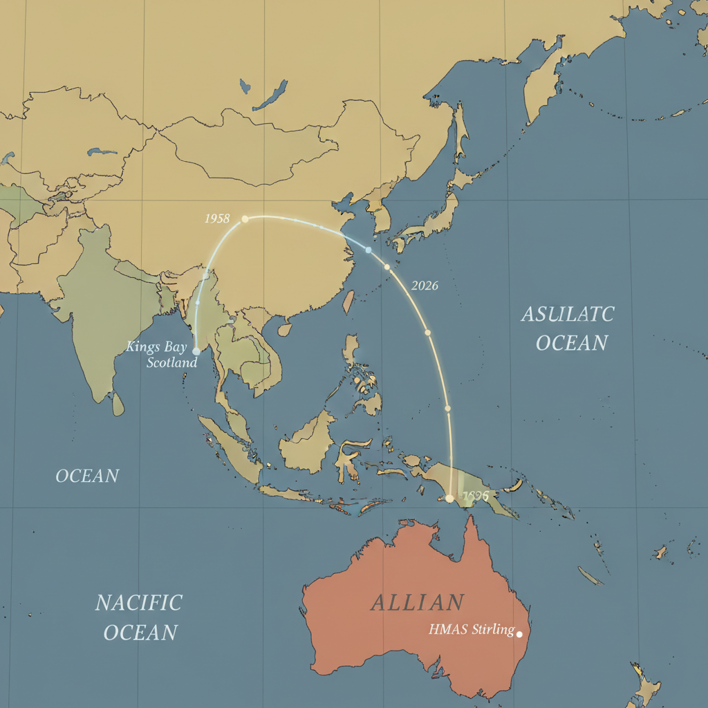 ![flat color political map, clean cartographic style, muted earth tones, no 3D effects, geographic clarity, professional map illustration, minimal ornamentation, clear typography, restrained color coding, flat 2D political map of the Pacific Ocean and North Atlantic, with subtle color differentiation between allied nations, clean boundary lines, and two faintly glowing curved routes connecting Groton, Connecticut to Faslane, Scotland (1958), and Kings Bay to HMAS Stirling (2026), each annotated with fine serif labels and dotted timeline markers, soft directional lighting from above, atmosphere of quiet strategic inevitability [Nano Banana] flat color political map, clean cartographic style, muted earth tones, no 3D effects, geographic clarity, professional map illustration, minimal ornamentation, clear typography, restrained color coding, flat 2D political map of the Pacific Ocean and North Atlantic, with subtle color differentiation between allied nations, clean boundary lines, and two faintly glowing curved routes connecting Groton, Connecticut to Faslane, Scotland (1958), and Kings Bay to HMAS Stirling (2026), each annotated with fine serif labels and dotted timeline markers, soft directional lighting from above, atmosphere of quiet strategic inevitability [Nano Banana]](https://081x4rbriqin1aej.public.blob.vercel-storage.com/viral-images/5f73fad7-d540-40bc-852c-5b47445f3e89_viral_1_square.png)