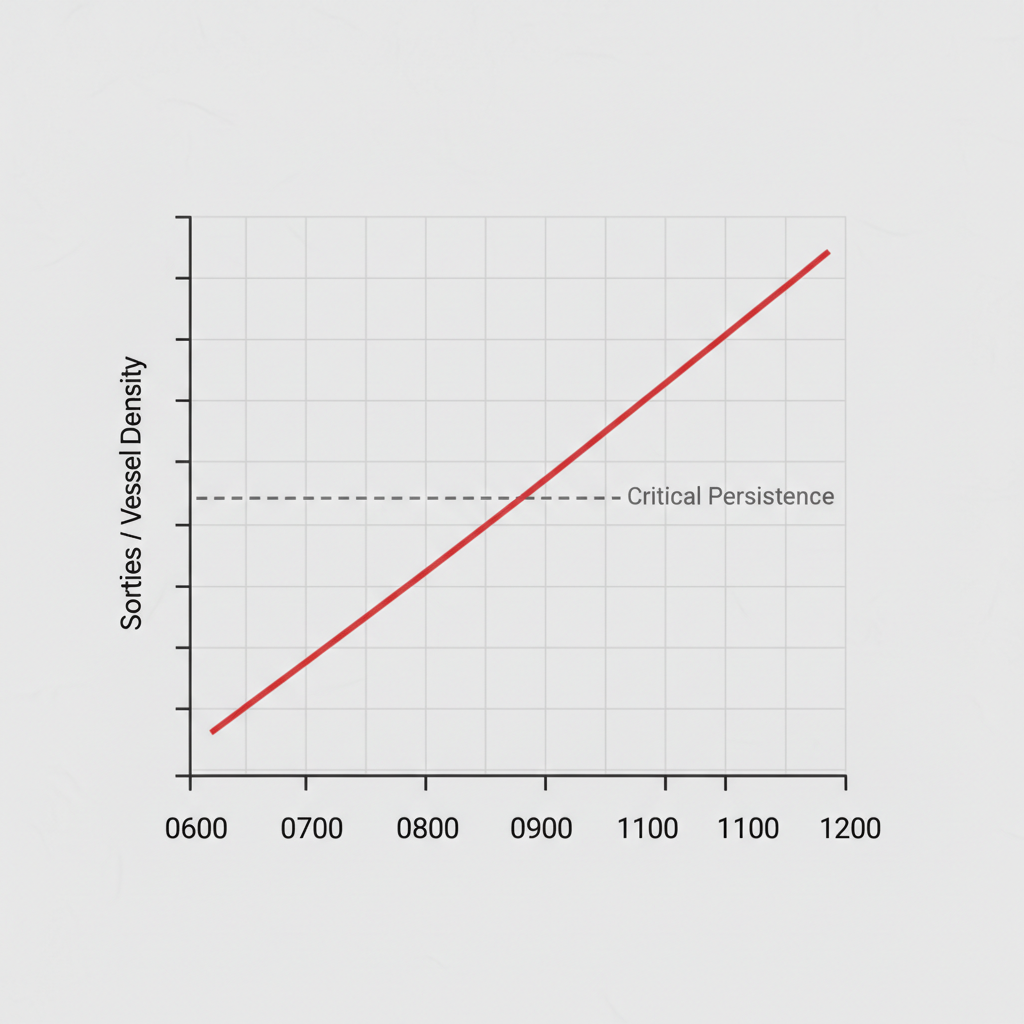 ![clean data visualization, flat 2D chart, muted academic palette, no 3D effects, evidence-based presentation, professional infographic, minimal decoration, clear axis labels, scholarly aesthetic, a stark two-dimensional line graph on a pale grid background, ink-dark axis lines, the x-axis marked in hourly increments from 0600 to 1200, the y-axis labeled 'Sorties / Vessel Density' in thin sans-serif font, a sharp red line climbing steadily from lower left to upper right, crossing a dashed threshold labeled 'Critical Persistence,' ambient top-down lighting casting faint graphite texture across the paper, atmosphere of silent inevitability [Nano Banana] clean data visualization, flat 2D chart, muted academic palette, no 3D effects, evidence-based presentation, professional infographic, minimal decoration, clear axis labels, scholarly aesthetic, a stark two-dimensional line graph on a pale grid background, ink-dark axis lines, the x-axis marked in hourly increments from 0600 to 1200, the y-axis labeled 'Sorties / Vessel Density' in thin sans-serif font, a sharp red line climbing steadily from lower left to upper right, crossing a dashed threshold labeled 'Critical Persistence,' ambient top-down lighting casting faint graphite texture across the paper, atmosphere of silent inevitability [Nano Banana]](https://081x4rbriqin1aej.public.blob.vercel-storage.com/viral-images/649971b1-aed5-4345-9fb3-19b5f5dec97a_viral_4_square.png)
