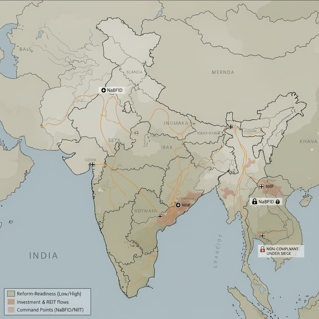 ![flat color political map, clean cartographic style, muted earth tones, no 3D effects, geographic clarity, professional map illustration, minimal ornamentation, clear typography, restrained color coding, flat 2D political map of India, clean vector-style lines delineating city economic regions, subtle gradient hues marking reform-readiness levels, arterial routes in pulsing amber tracing InVIT and REIT flows, annotated command points for NaBFID and NIIF, faint crosshatch zones isolating non-compliant cities under siege, overhead perspective, muted but tense atmosphere [Nano Banana] flat color political map, clean cartographic style, muted earth tones, no 3D effects, geographic clarity, professional map illustration, minimal ornamentation, clear typography, restrained color coding, flat 2D political map of India, clean vector-style lines delineating city economic regions, subtle gradient hues marking reform-readiness levels, arterial routes in pulsing amber tracing InVIT and REIT flows, annotated command points for NaBFID and NIIF, faint crosshatch zones isolating non-compliant cities under siege, overhead perspective, muted but tense atmosphere [Nano Banana]](https://081x4rbriqin1aej.public.blob.vercel-storage.com/viral-images/a0f9b353-d061-4eb9-afa9-1a648556ea3b_viral_1_square.png)