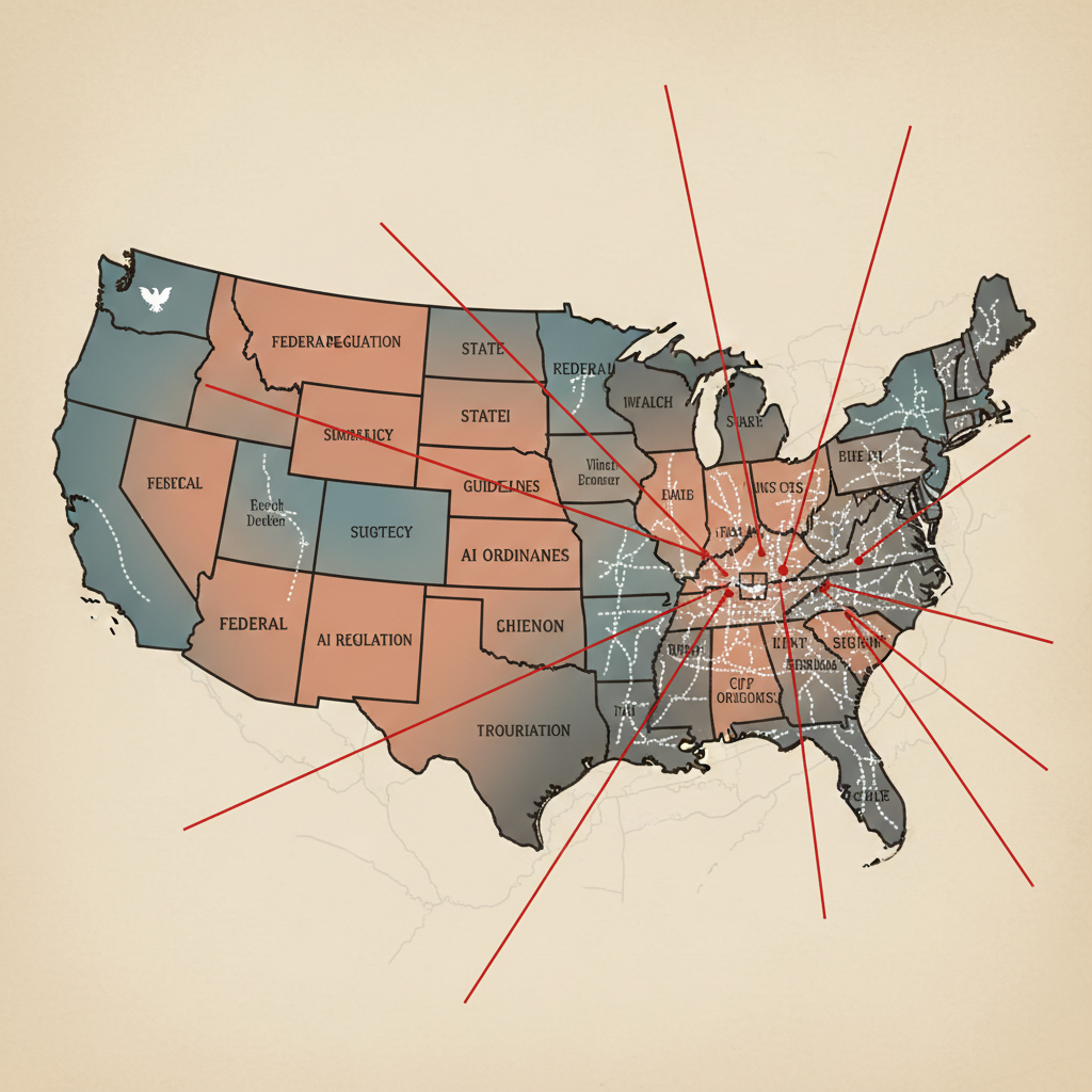 ![flat color political map, clean cartographic style, muted earth tones, no 3D effects, geographic clarity, professional map illustration, minimal ornamentation, clear typography, restrained color coding, a flat 2D political map of the United States, inked lines dividing federal, state, and city jurisdictions, subtle gradient washes in slate blue, terracotta, and charcoal marking different AI governance zones, ancient road traces fading beneath like the cursus, dotted predictive algorithm paths branching only within city boundaries, bold red annotation lines extending from federal centers into surveillance corridors, dim ambient overhead lighting, archival atmosphere [Nano Banana] flat color political map, clean cartographic style, muted earth tones, no 3D effects, geographic clarity, professional map illustration, minimal ornamentation, clear typography, restrained color coding, a flat 2D political map of the United States, inked lines dividing federal, state, and city jurisdictions, subtle gradient washes in slate blue, terracotta, and charcoal marking different AI governance zones, ancient road traces fading beneath like the cursus, dotted predictive algorithm paths branching only within city boundaries, bold red annotation lines extending from federal centers into surveillance corridors, dim ambient overhead lighting, archival atmosphere [Nano Banana]](https://081x4rbriqin1aej.public.blob.vercel-storage.com/viral-images/c700794c-fa27-4756-bedf-1d9e9fe750f6_viral_1_square.png)