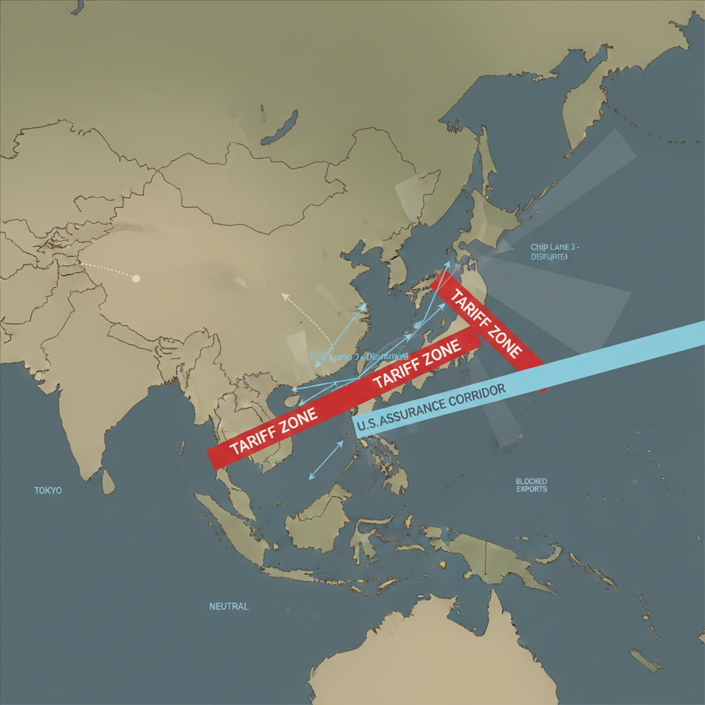 ![flat color political map, clean cartographic style, muted earth tones, no 3D effects, geographic clarity, professional map illustration, minimal ornamentation, clear typography, restrained color coding, flat 2D map of the Western Pacific, clean vector lines delineating national boundaries, with bold red bands constricting sea lanes around Japan, thin blue lines indicating fragile semiconductor supply routes extending toward Taiwan and South Korea, faint gray arrows showing blocked exports from China, soft gradient shading distinguishing neutral vs. aligned territories, annotated with minimal text labels: 'Chip Lane 3 - Disrupted', 'Tariff Zone', 'U.S. Assurance Corridor', subtle dotted line linking Tokyo to Washington, lighting from above casting no shadows, atmosphere clinical and tense like a war room projection [Nano Banana] flat color political map, clean cartographic style, muted earth tones, no 3D effects, geographic clarity, professional map illustration, minimal ornamentation, clear typography, restrained color coding, flat 2D map of the Western Pacific, clean vector lines delineating national boundaries, with bold red bands constricting sea lanes around Japan, thin blue lines indicating fragile semiconductor supply routes extending toward Taiwan and South Korea, faint gray arrows showing blocked exports from China, soft gradient shading distinguishing neutral vs. aligned territories, annotated with minimal text labels: 'Chip Lane 3 - Disrupted', 'Tariff Zone', 'U.S. Assurance Corridor', subtle dotted line linking Tokyo to Washington, lighting from above casting no shadows, atmosphere clinical and tense like a war room projection [Nano Banana]](https://081x4rbriqin1aej.public.blob.vercel-storage.com/viral-images/d941281b-a165-4e66-9de2-b3478cbd6247_viral_1_square.png)