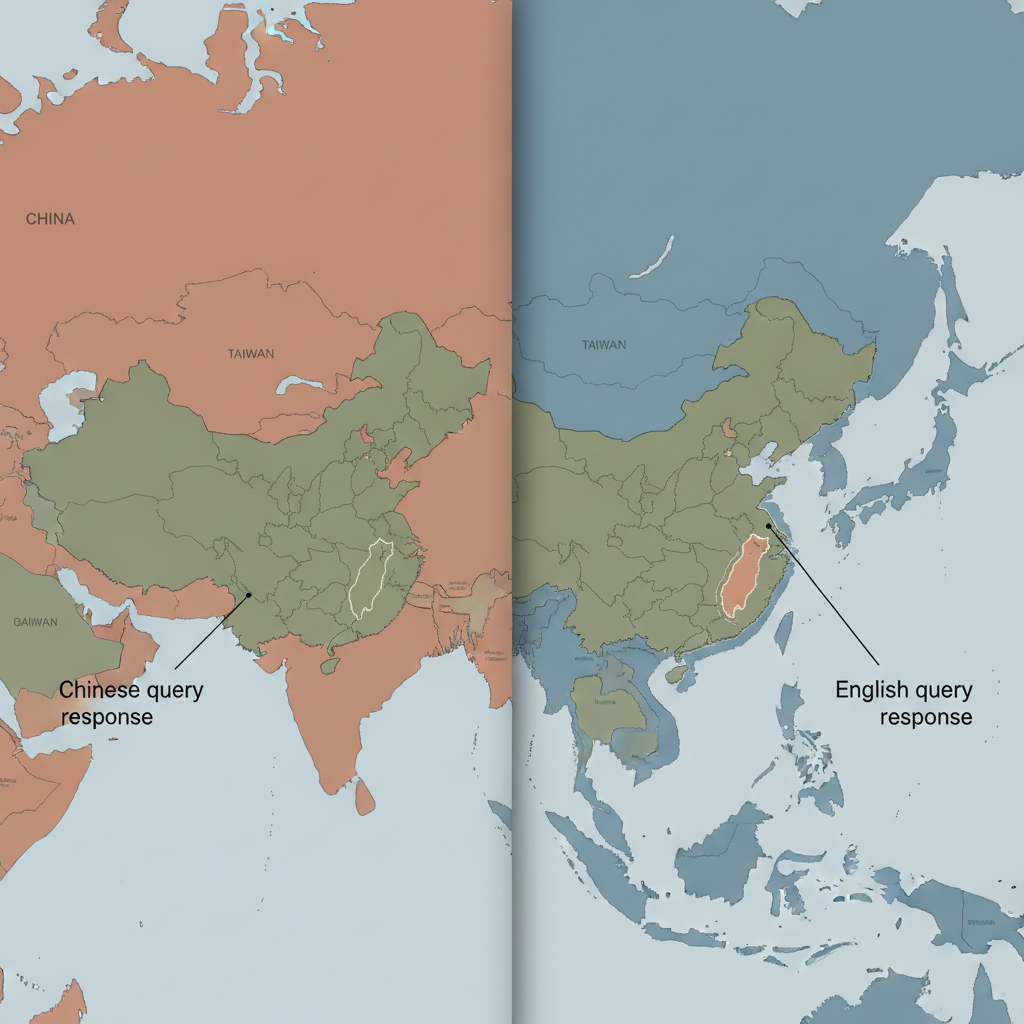![flat color political map, clean cartographic style, muted earth tones, no 3D effects, geographic clarity, professional map illustration, minimal ornamentation, clear typography, restrained color coding, flat 2D political map of East Asia, split down the Taiwan Strait with left side showing Taiwan in same color and integrated border as mainland China, right side showing Taiwan in distinct color with international boundary line, subtle gradient divide at center, annotation lines pointing to each version labeled 'Chinese query response' and 'English query response', clean vector lines, muted official tones, overhead schematic lighting, clinical yet tense atmosphere [Nano Banana] flat color political map, clean cartographic style, muted earth tones, no 3D effects, geographic clarity, professional map illustration, minimal ornamentation, clear typography, restrained color coding, flat 2D political map of East Asia, split down the Taiwan Strait with left side showing Taiwan in same color and integrated border as mainland China, right side showing Taiwan in distinct color with international boundary line, subtle gradient divide at center, annotation lines pointing to each version labeled 'Chinese query response' and 'English query response', clean vector lines, muted official tones, overhead schematic lighting, clinical yet tense atmosphere [Nano Banana]](https://081x4rbriqin1aej.public.blob.vercel-storage.com/viral-images/e52aae9b-b265-411a-81ad-937e89edb4d8_viral_1_square.png)